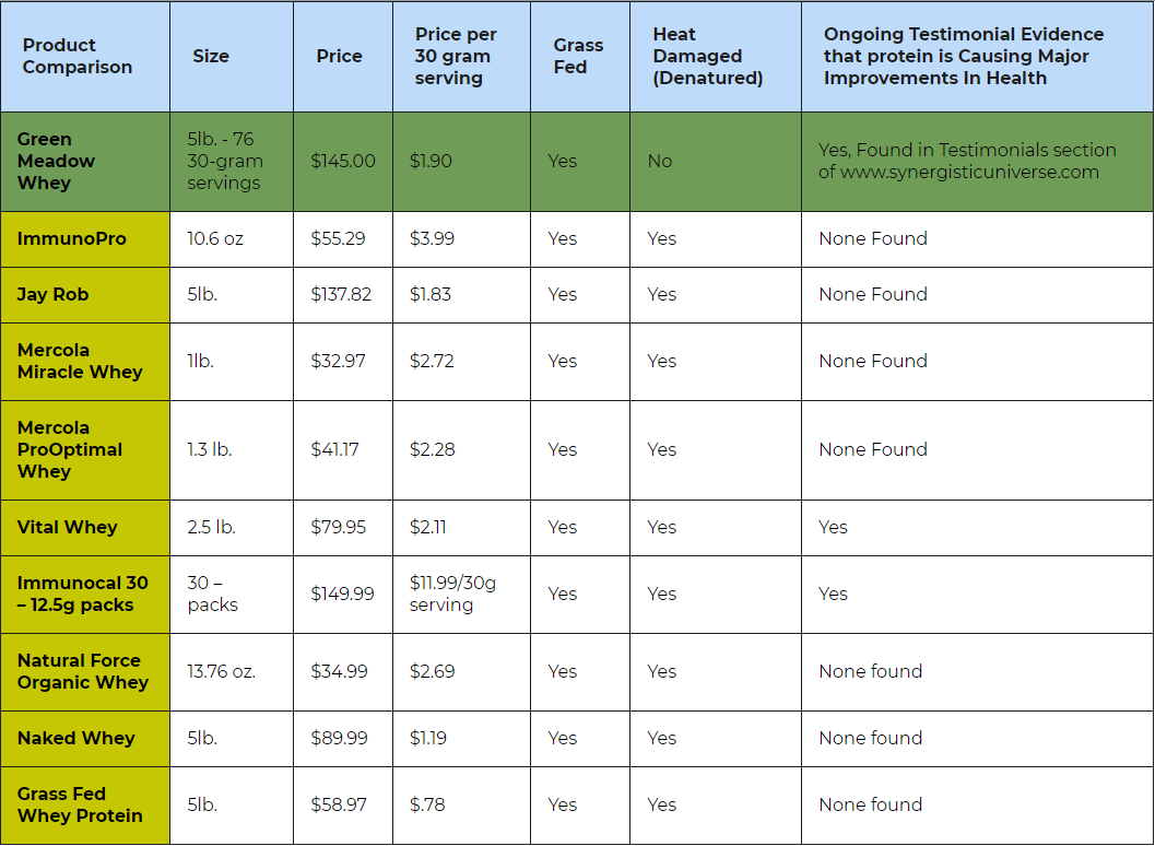 I have used and recommended $300 dollar out the door, sophisticated mercury detox protocols that based upon observation appear to pale in comparison to the detoxing power and health building benefits of Green Meadow Whey. Green Meadow Whey as a detoxifier and health building food compared to a more expensive detox protocols is a fraction of the price.