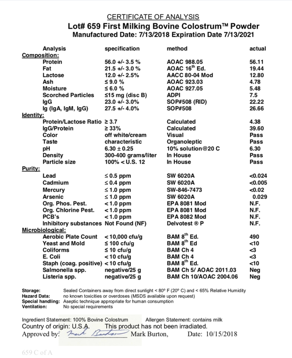 The fresh colostrum is raw-processed by proprietary methods to assure maximum biological activity. Every batch is tested for purity and safety and is certified to be only true First Milking Colostrum.