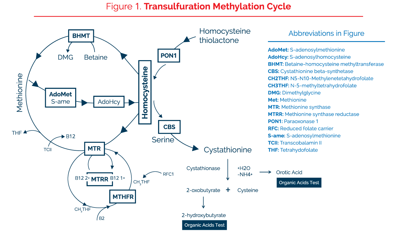 Excess Homocysteine: A Key Factor in Cardiovascular Disease, Psychiatric Disorders, Cancer, Hip Fractures, and Alzheimer’s Disease Homocysteine, a non-protein sulfur amino acid, is an intermediate product of the methionine cycle, also called the transsulfuration methylation cycle (Figure 1) that closely links sulfur amino acid metabolism with key methylation reactions. Homocysteine is formed from the catabolism of S-adenosylmethionine or by the conversion of toxic homocysteine thiolactone to homocysteine by paraoxonase 1 (PON1), the same enzyme that detoxifies organophosphate pesticides. The clearance of homocysteine requires the presence of methyltetrahydrofolate, methylcobalamin, betaine, or pyridoxal-5-phosphate. Methylcobalamin is such a powerful methylating co-enzyme that it can methylate homocysteine directly to methionine without an associated enzyme.