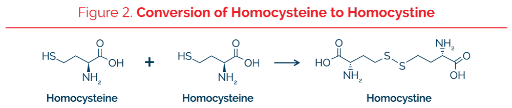 Kilmer McCully was one of the first investigators to develop an interest in the toxic effects of homocysteine as a major risk factor in atherosclerosis. After investigating cases of classic homocystinuria in patients who had abnormally increased plasma total homocysteine and severe atherosclerosis even as a teenager, McCully began to investigate moderate elevations of homocysteine as a cause of atherosclerosis in a large section of the entire population. Individuals with the severe genetic deficiency of the enzyme cystathionine b-synthase had concentrations of total plasma homocysteine as high as 300 mmol/L. High homocysteine is also associated with other cardiovascular risk factors such as insulin resistance, metabolic syndrome, and type 2 diabetes mellitus. The optimum plasma homocysteine appears to be 6-7 micromoles/liter. The amino acid homocysteine has a sulfhydryl group that is hydrogenated (SH) while homocysteine in the oxidized state is bonded to another sulfhydryl group, either to another homocysteine in which the molecule is called homocystine or oxidized homocysteine or to the sulfhydryl group of another different protein or peptide (Figure 2). In the test performed at The Great Plains Laboratory, all forms of the molecule are converted to the reduced form with a free –SH group prior to quantitation.