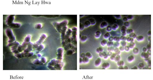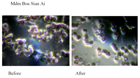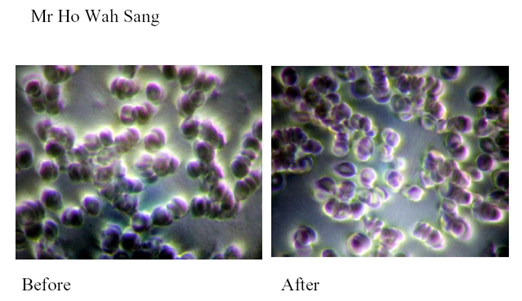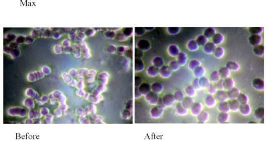 Live Blood Cell Analysis was conducted at facility of Elixir Health Ltd., Singapore by analyst Patrick Tan according to the standard methodology. A drop of blood sample was taken from the fingertip of the subject who was not drinking MRET water for 24 hours. This sample was placed on a specimen slide and spread into a thin layer by a glass cover. The glass cover is then placed over the thin layer of blood. Digital camera attached to microscope took an image of the sample. Then the same subject drank one glass (8 oz.) of MRET water and in 20 minutes a drop of blood sample was taken from the fingertip one more time. Sample was observed under the microscope, and digital camera took another image. These two images were compared and analyzed. The experiment was conducted on 4 subjects. The images of the blood sample taken before the consumption of MRET water show the patterns known as Rouleau formation of red blood cells. Blood cells are stacked forming worm-like patterns. This type of red blood cells morphology usually leads to development of such symptoms as fatigue, shortness of breath, and poor blood circulation in hands and feet because such red blood cells cannot carry enough oxygen.