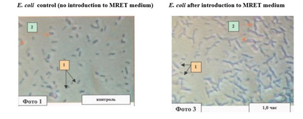 Figure 8: The experiment was conducted on E. coli bacteria in the aerobic environment. Picture #1 - control sample after 24 hours of incubation. Picture #3 - activated sample (60 minutes activation) after 24 hours of incubation. I9 - index of abnormal cellular division. Control sample I9 = 4%; 60 minutes activation sample I9 =220%. Activated (MRET) water produces significant changes of E. coli morphology: different shape, color and size of cells, disturbance of process of cellular division. Adaptation mutation of E. coli cells. /1/ - normal cellular division; /2/ - abnormal cellular division.