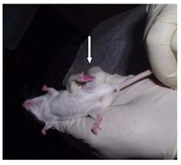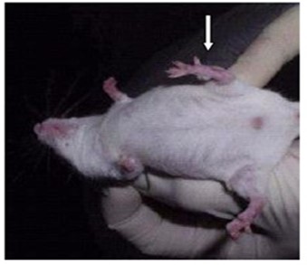 Figure 3: The view of paws of a mouse on non-activated water (reddening of the injected paw) in 24 hours after the injection of Staphylococcus culture.