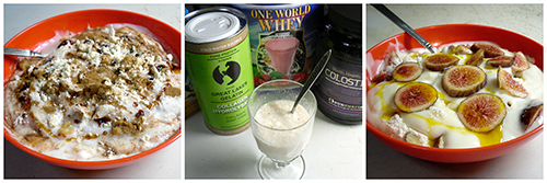 I enjoy the whey almost daily with several foods; as you can see in the photos, I took some fresh figs from the backyard tree, added some yogurt, coconut cream, strawberry One World Whey, colostrum, wheat germ oil, and had a delicious dessert!