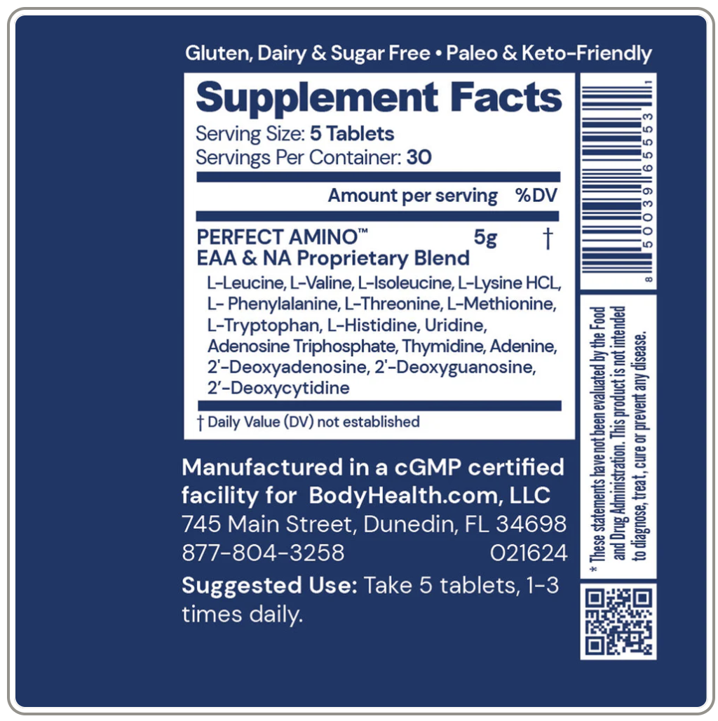 BodyHealth's flagship product, PerfectAmino, is revolutionizing protein synthesis. PerfectAmino is utilized up to 99% to help build new protein, muscle & collagen without the caloric impact of other dietary proteins & without breaking a fast. It is further supplemented with Nucleic Acid building blocks to help direct the process of Protein Synthesis.
